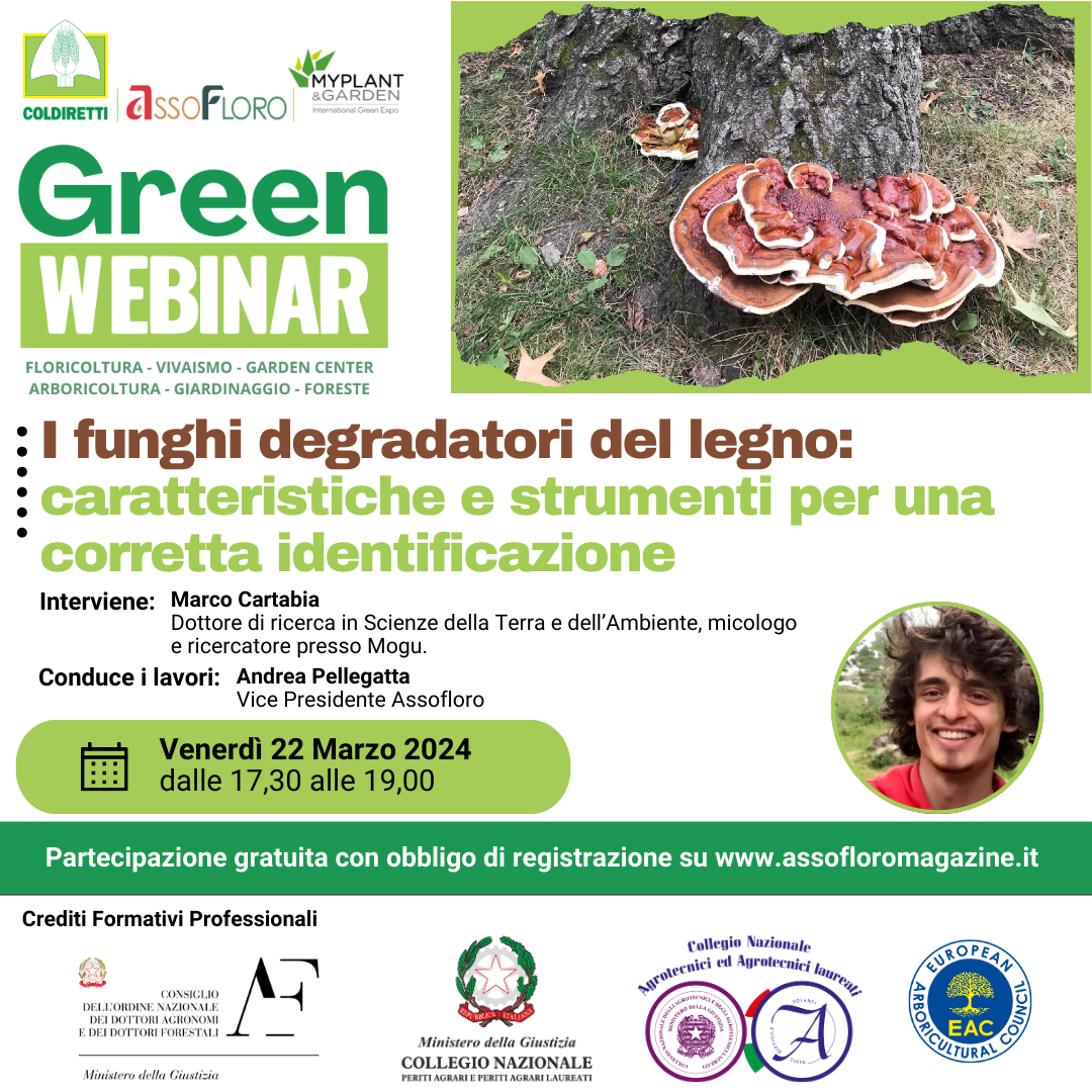 Nel secondo GreenWebinar di Assofloro e Coldiretti si parlerà di funghi che degradano il legno con Marco Cartabia, Dottore di ricerca in Scienze della Terra e dell’Ambiente, micologo e ricercatore presso Mogu, azienda che sperimenta applicazioni del micelio dei funghi per la costruzione di biomateriali.