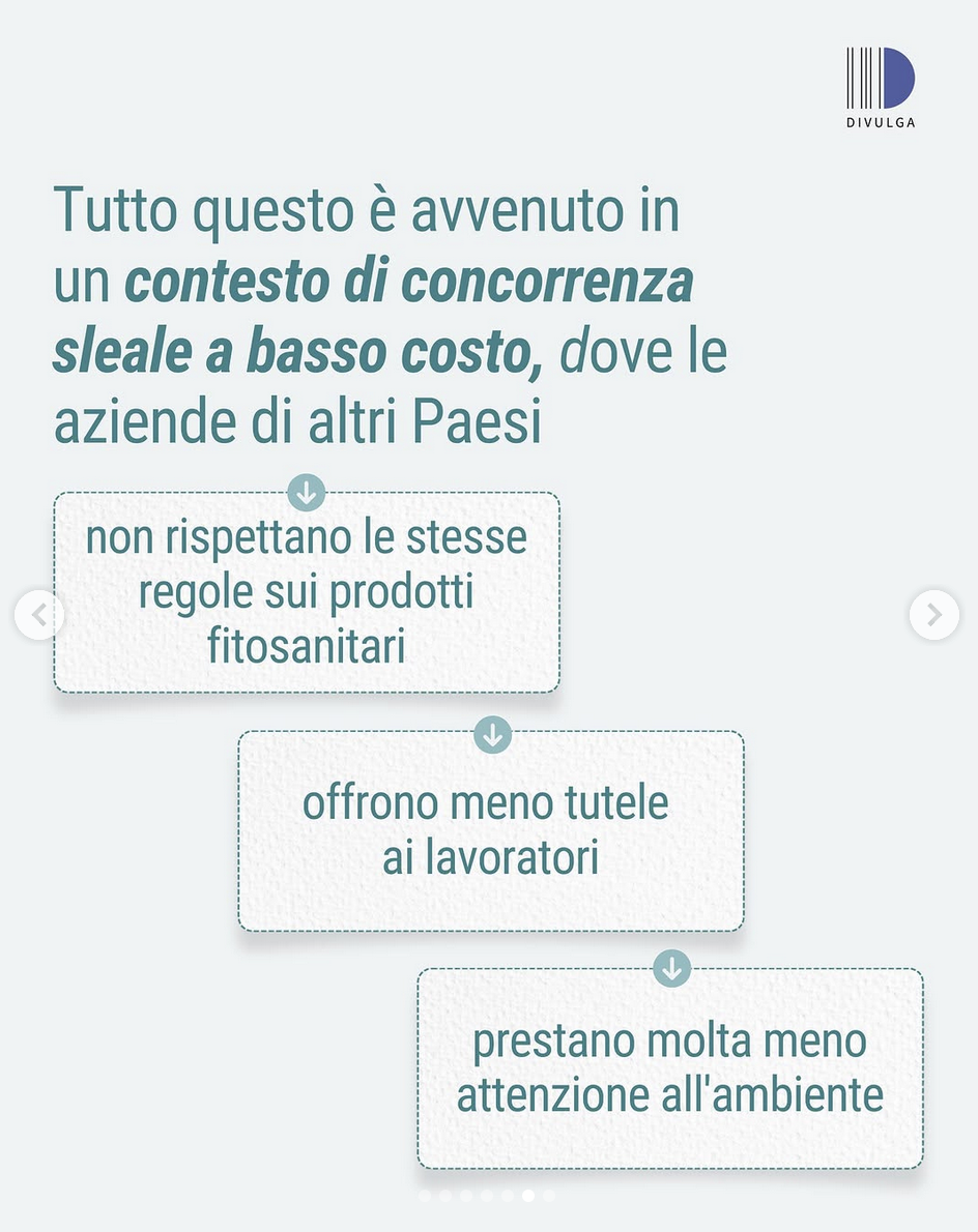 Costi in progressivo aumento che ancora fanno fatica ad essere riassorbiti, tanto più se si considera la concorrenza sleale con importazioni a basso costo dall’estero, dove non si rispettano le stesse regole in termini di utilizzo dei prodotti fitosanitari, ma anche di tutela dei diritti dei lavoratori e dell’ambiente.